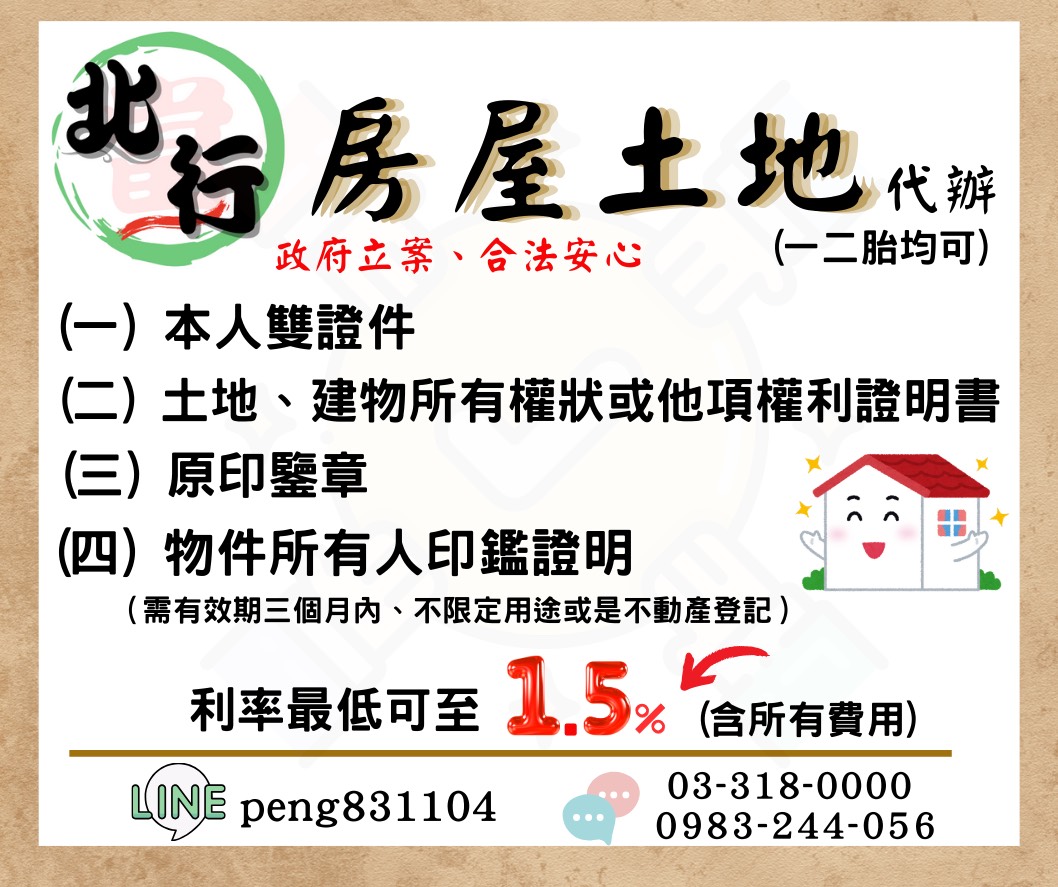 配合知名代書事務所,安全、可靠、迅速。 您的物件,北行替您最短時間找出最高價值、最低利息。